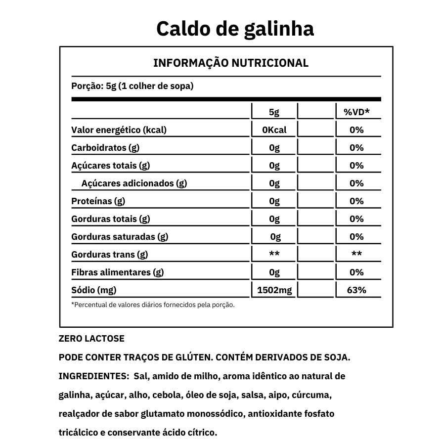 Ingredientes: Sal, amido de milho, aroma idêntico ao natural de galinha, açúcar, alho, cebola, óleo de soja, salsa, aipo, cúrcuma, realçador de sabor glutamato monossódico, antioxidante fosfato tricálcico e conservante ácido cítrico.